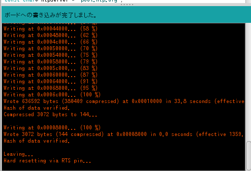 「Connecting……  ……  ….. 」この間に本体(ESP32ボード)上にあるBootボタンを押すことで下記のように書き込みが可能になります。