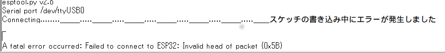 書き込みごとにこのエラーが出続けるため、いろいろ調べたところ、コンパイル→ESP32ボードへIDEから接続(connected)するときに本体(ESP32ボード)のBootボタンを一時的に押さなければならないことが判明。